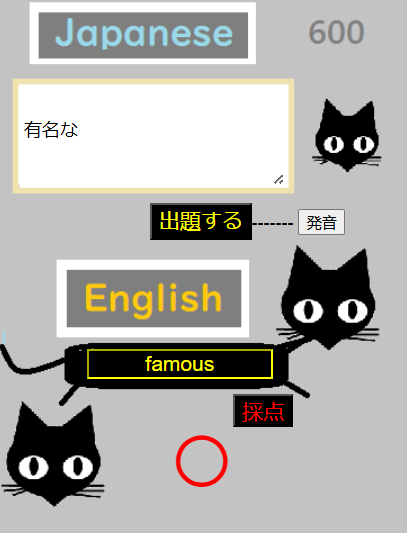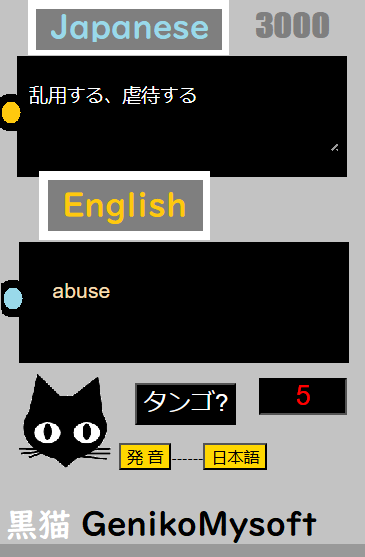 英単語アプリの黒猫バージョンです。収録単語は5000語となります。高校入試・基本単語1600語、完全マスター3000語があります。